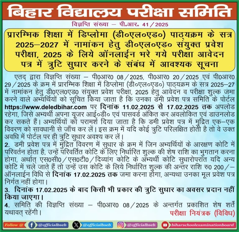 Bihar DElEd Dummy Admit Card 2025 :- बिहार स्कूल एग्जामिनेशन बोर्ड ने बिहार डीएलएड का डमी प्रवेश पत्र जारी करने जा रहा है। बिहार डीएलएड के आधिकारिक वेबसाइट www.deledbihar.com पर जारी किया जाएगा। जो भी उम्मीदवार बिहार डीएलएड का फॉर्म भरे थे वह सभी डमी एडमिट कार्ड को जरुर डाउनलोड करें। डमी एडमिट कार्ड में अगर आपका कोई भी पर्सनल जानकारी गलत है तो उसको सुधार सकते हैं। बिहार डीएलएड का डमी एडमिट कार्ड कैसे चेक करना होगा और अगर आपका फॉर्म गलत हो गया है तो कैसे सुधारना होगा इसकी जानकारी इसी पेज पर आगे बताई गई है। इसके बारे में और अधिक जानकारी प्राप्त करना चाहते हैं तो आधिकारिक वेबसाइट पर जाएं लिंग के नीचे दिया गया है।