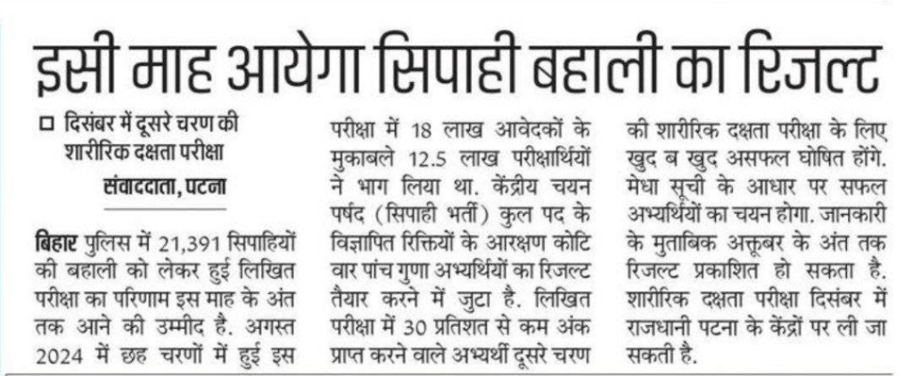 सेंट्रल सिलेक्शन बोर्ड का कांस्टेबल CSBC के आधिकारिक वेबसाइट पर बिहार पुलिस कांस्टेबल भर्ती 2024 का रिजल्ट जारी किया जाएगा। जो भी कैंडिडेट इसके परीक्षा में शामिल हुए थे वह सभी अपना रिजल्ट आसानी से चेक कर पाएंगे। रिजल्ट कब जारी होगा नीचे दिए गए पेपर की कटिंग में देखने को मिल जाएगा। रिजल्ट से संबंधित और अधिक जानकारी प्राप्त करना चाहते हैं तो आप आधिकारिक वेबसाइट पर जाएं सीधा लिंक नीचे मिल जाएगा। Bihar Police Constable Result 2024 Date