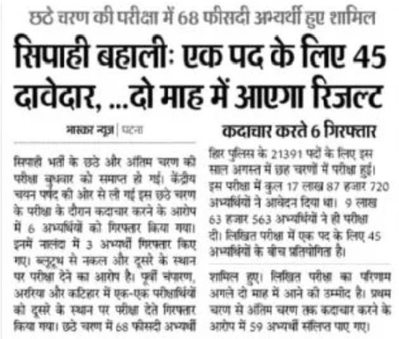 जैसे आप सभी को पता होगा आप सभी का रिजल्ट 7 से लेकर 28 अक्टूबर के बीच बिहार पुलिस कांस्टेबल भर्ती 2023 का परीक्षा आयोजित किया गया था। लेकिन परीक्षा देने के बाद सभी कैंडिडेट रिजल्ट का इंतजार कर रहे हैं। आप सभी को बता दूं भास्कर न्यूज़ पेपर कटिंग के माने तो परीक्षा के 2 महीने के अंदर इसका रिजल्ट जारी किया जाएगा। पेपर का कटिंग नीचे दिया गया है आप भी उसको पढ़ सकते हैं। इसी के हिसाब से आपका रिजल्ट अक्टूबर के महीने में कभी भी जारी किया जा सकता है। रिजल्ट कैसे देखना होगा इसकी जानकारी आगे दी गई है आगे दी गई जानकारी को आप चेक करें।