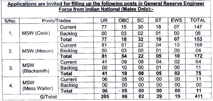 | पद का नाम | MSW (Cook, Mason, Blacksmith, Mess Waiter) |