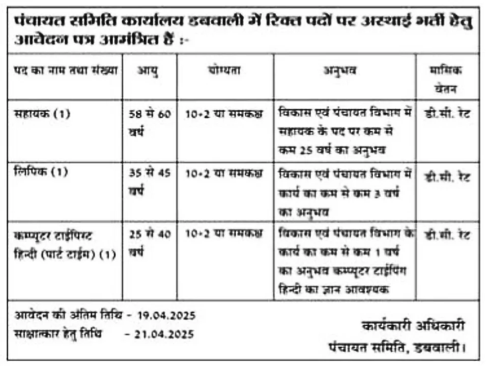 कार्यालय कार्यकारी अधिकारी, पंचायत समिति, डबवाली, सिरसा ने हाल ही में सहायक, क्लर्क, कंप्यूटर टाइपिस्ट हिंदी के पद के लिए रिक्तियों का विज्ञापन किया है। विज्ञापन संख्या हरियाणा पंचायत समिति रिक्ति 2025 के लिए ऑनलाइन आवेदन 19 मार्च, 2025 को आधिकारिक वेबसाइट (Sirsa.gov.in) पर आमंत्रित किए जाएंगे। यदि आप इस भर्ती में रुचि रखते हैं और सभी मानदंडों को पूरा करते हैं, तो इसके लिए आवेदन करें।