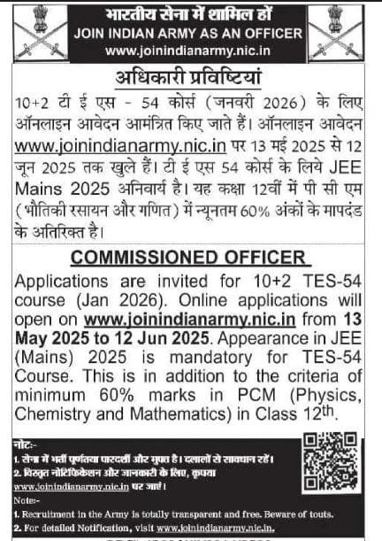 Indian Army TES Recruitment 2025 – Indian Army ने 10+2 TES 54 course का आवेदन नोटिफिकेशन के अनुसार 13 मई 2025 से शुरू कर रहा है | आप सभी अपना आवेदन 12 जून 2025 तक कर सकते हैं | सभी राज्य के उम्मीदवारों को संबंधित पद पर आवेदन करने का मौका मिल रहा है | आप सभी उम्मीदवार सबसे पहले नोटिफिकेशन की जांच करें और अपना आवेदन कर बैठे आवेदन की अंतिम तिथि से पहले समाप्त करेंगे | आवेदन करने की पूरी प्रक्रिया आप सभी को ऑनलाइन माध्यम से इस पेज पर नीचे दिखेगी | केवल योग्य उम्मीदवारों को ही आवेदन करने का मौका दिया जा रहा है |Indian Army TES Recruitment 2025