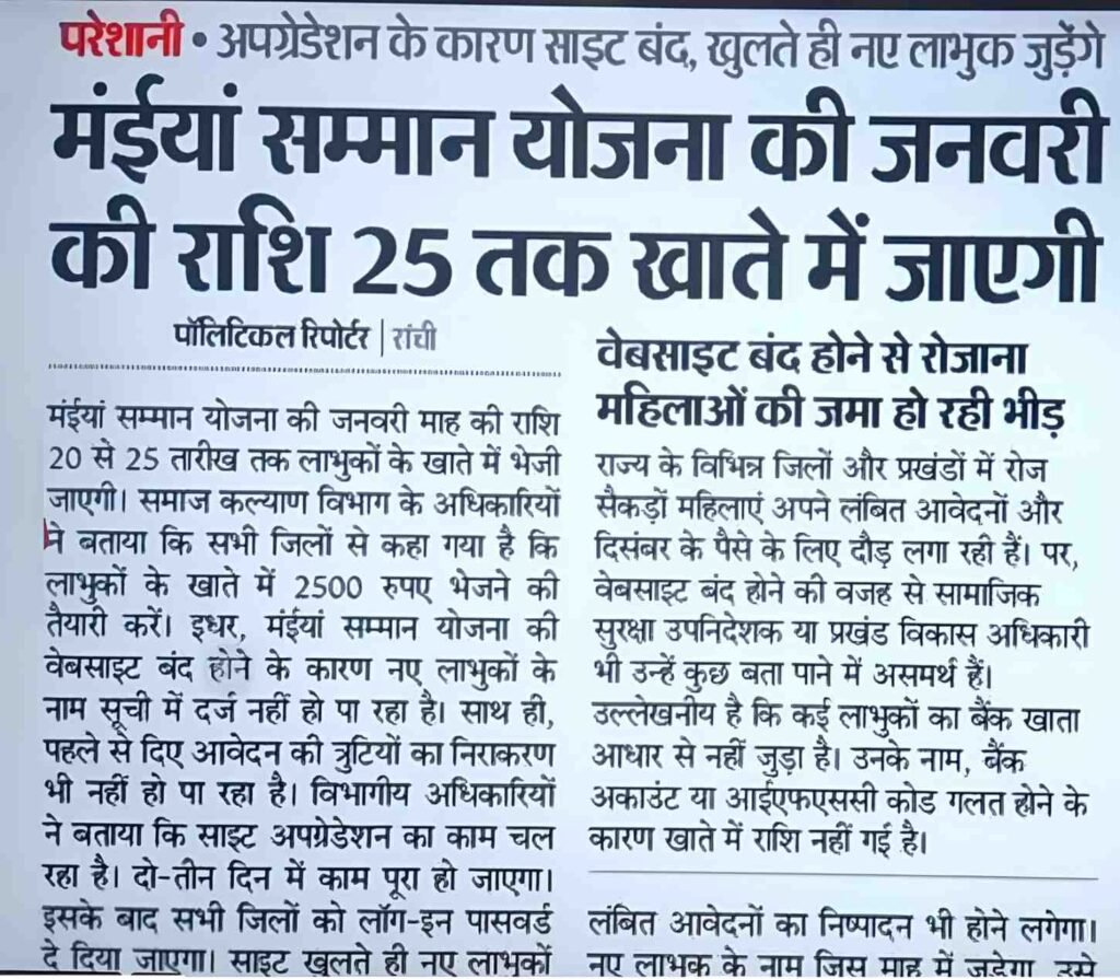 झारखंड मुख्यमंत्री मैया सम्मान योजना का शुरुआत झारखंड के मुख्यमंत्री हेमंत सोरेन जी के द्वारा अगस्त 2024 में किया गया था। इस योजना के तहत अभी तक पांच किस्त की राशि लाभार्थी महिलाओं को प्राप्त हो चुका है। जैसे आप सभी को पता होगा कर किस्त तक ₹1000 प्रति महीने दिए गए थे लेकिन पांचवी किस्त से महिलाओं को ₹2500 प्रति महीने दिए जा रहे हैं। पांचवी किस्त का राशि बहुत सारी महिलाओं को प्राप्त हो चुका है