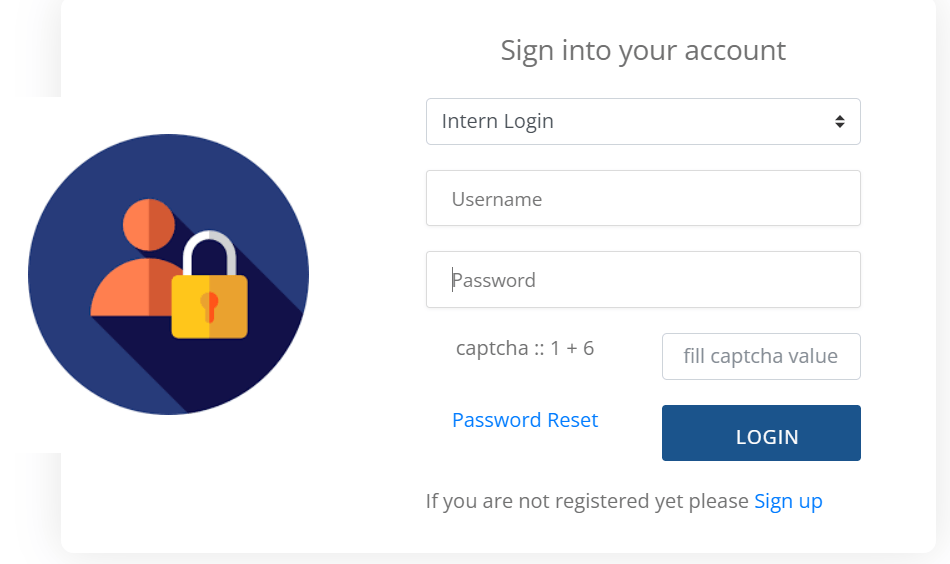 - अब आपको ऊपर दिए गए लॉगिन पर क्लिक कर Intern Login सेलेक्ट करें, रजिस्टर्ड एट प्लीज साइन ऑफ पर क्लिक करें।