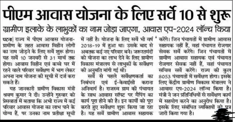 आप सभी को बता दूं बिहार पीएम आवास योजना का सर्वे 10 जनवरी 2025 से शुरू हो चुका है और आगामी 31 मार्च 2025 तक संचालित किया जाएगा। ऐसे ग्रामीण है जो अभी तक प्रधानमंत्री ग्रामीण आवास योजना का लाभ नहीं उठाया है तो उनके लिए अच्छा मौका है। यह सर्वे खास करके वैसे लोगों के लिए ही शुरू किया गया है जिनको अभी तक आवास का लाभ प्राप्त नहीं हुआ है। क्या है सवैया सभी जानकारी आप सभी को इसी पेज पर देखने को मिलेगा और लास्ट में सर्वे का लिंक भी देखने को मिल जाएगा।
